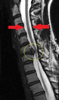 Resim 4: Omuriliği (yukarıdan aşağı uzanan, iki kırmızı ok arasında gösterilen beyaz alan) sıkıştırmış bir boyun fıtığının (sarı daire içerisinde) MR görüntüsü.