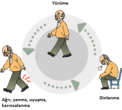 Hastalarda sırt, bel ağrısı, ayaklarda güç kaybı ve uyuşma görülebilir. Hastalarda en belirgin bulgu belirli bir mesafe yürüdükten sonra bacaklarda ortaya çıkan kramp ve kasılmalardır. Zamanla bu bulguların ortaya çıktığı yürüme mesafe azalır ve çok ileri dönemlerde hastalar ev içindeki yürüme dönemlerinde dahi bacaklarda kramp ve kasılma sorunlarıyla karşı karşıya kalırlar. Yürümekte olan hastalar kramp ve kasılma meydana geldiğinde dinlenirlerse şikayetleri azalır. Sonra tekrar yürümeye başladıklarında yine aynı sorunla karşı karşıya kalırlar. Hastalarda bel ve kalçadan başlayıp bacağa, ayağa yayılan ağrı olabilir.